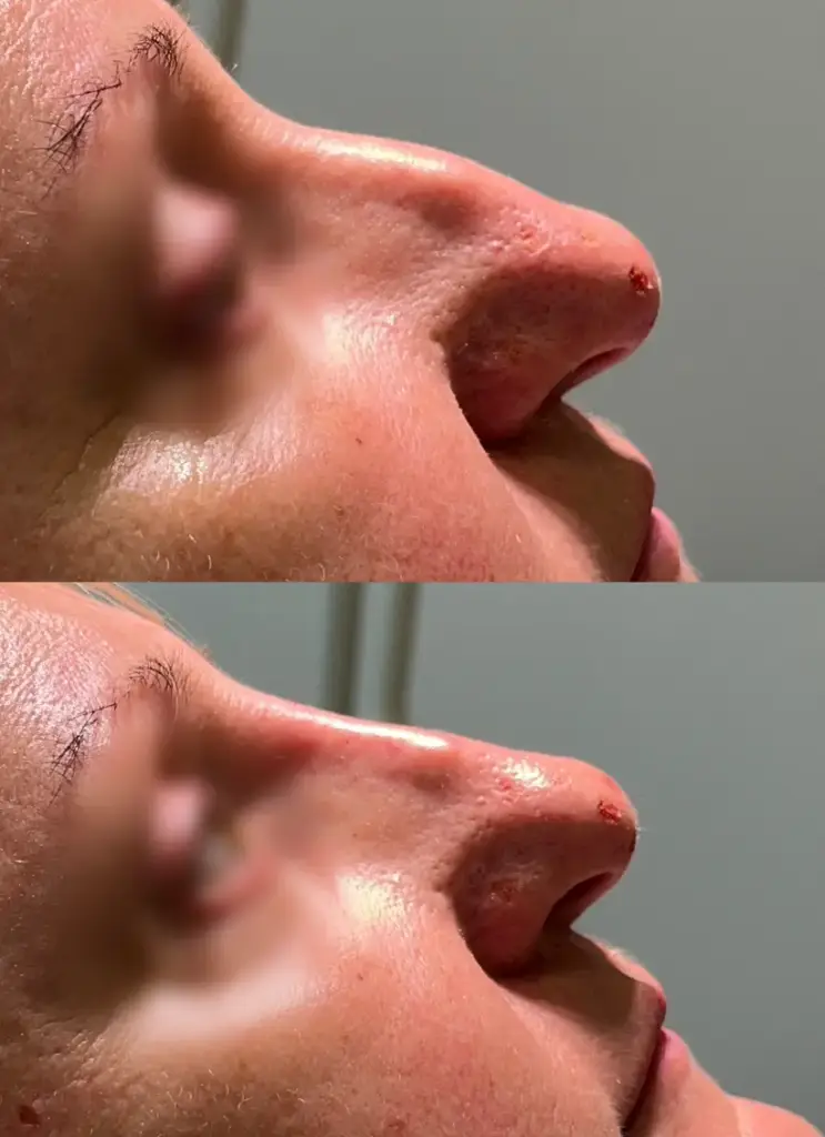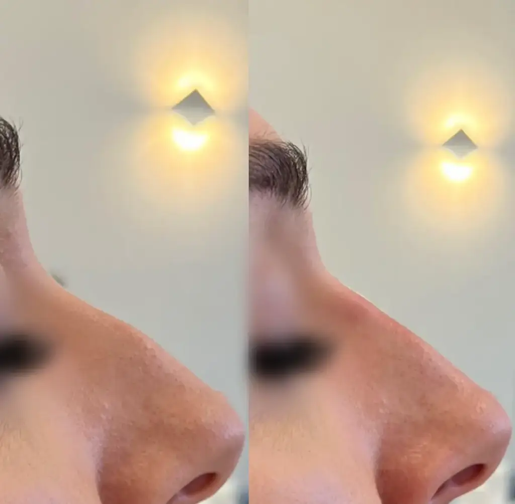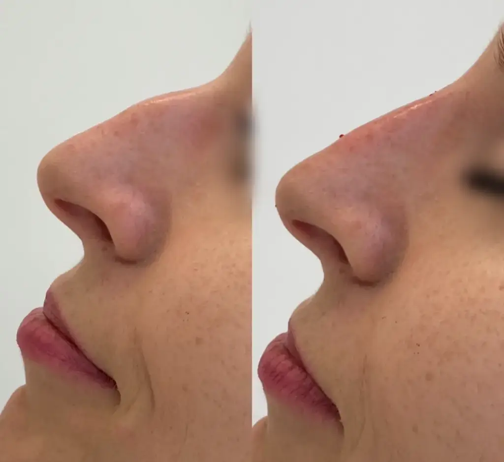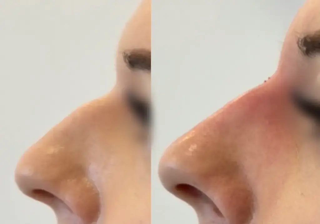 Czasem po zabiegu niechirurgicznej korekty nosa może pojawić się drobny efekt uboczny w postaci nadmiernej wrażliwości nosa, obrzęku bądź małego siniaka. Wszelkie objawy tego rodzaju znikają jednak w ciągu kilku następnych dni. Przez kilka dni po zabiegu należy również unikać ekstremalnych temperatur oraz zrezygnować z opalania się zarówno na słońcu, jak i na solarium.